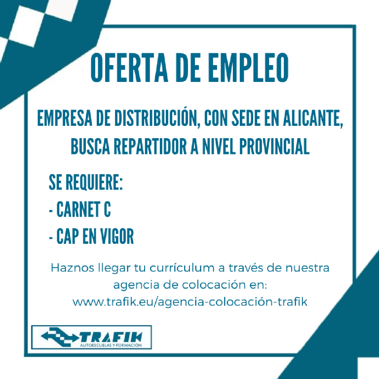 Empresa de distribución con sede en Alicante busca conductor para reparto a nivel provincial.